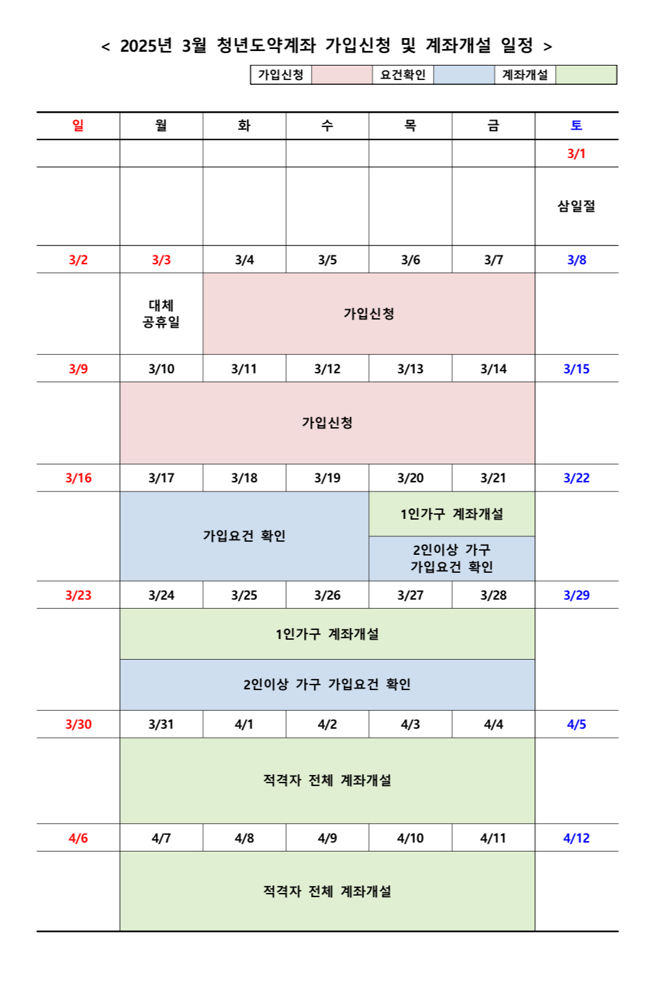 이번 3월에는 가입 신청 기간과 계좌 개설 기간이 다릅니다. 정확한 일정은 아래와 같습니다.